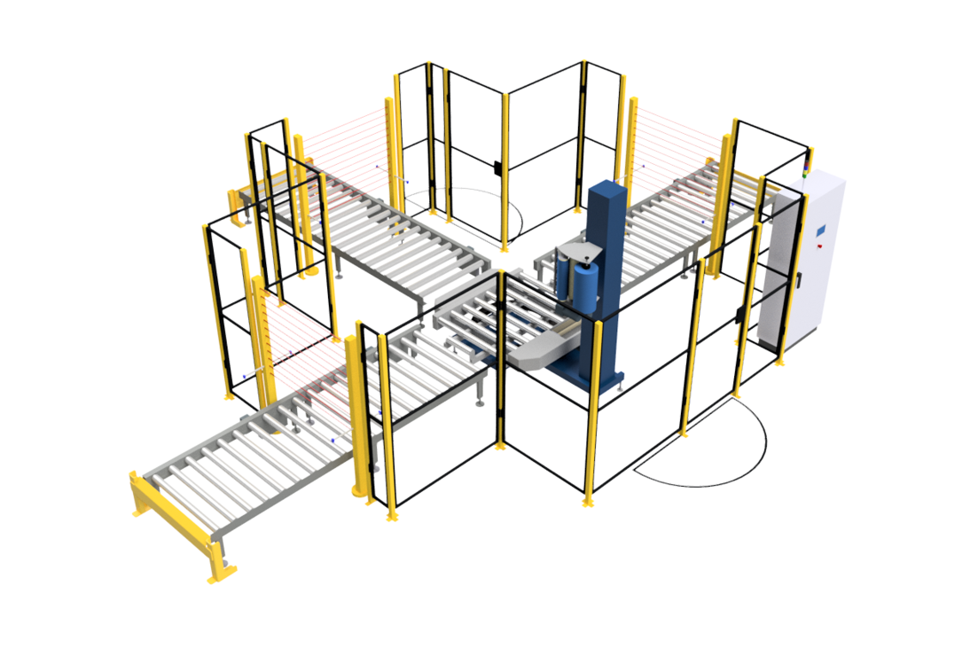 Løsningen har to output-optioner, der ofte anvendes til f.eks. ekstra bufferplads eller variable produkter med forskellige destinationer. Løsningen sikrer fleksibilitet og effektivitet i produktionsprocessen, og kan tilpasses specifikke behov, hvilket gør den til en ideel løsning til mindre produktionsmiljøer.